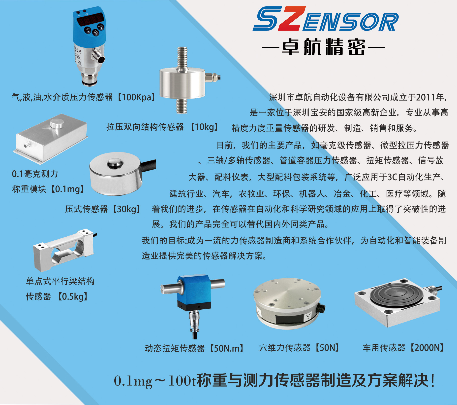 目前,我們的主要產(chǎn)品,如拉壓力傳感器、六維力傳感器、0.1mg稱重傳感器,氣、液、油、水壓力傳感器、扭矩傳感器、信號(hào)放大器、配料儀表,大型配料包裝系統(tǒng)等,廣泛應(yīng)用于3C自動(dòng)化生產(chǎn)、建筑行業(yè)、汽車,農(nóng)牧業(yè)、環(huán)保、機(jī)器人、冶金、化工、醫(yī)療等領(lǐng)域。隨著我們的進(jìn)步,在傳感器在自動(dòng)化和科學(xué)研究領(lǐng)域的應(yīng)用上取得了突破性的進(jìn)展。