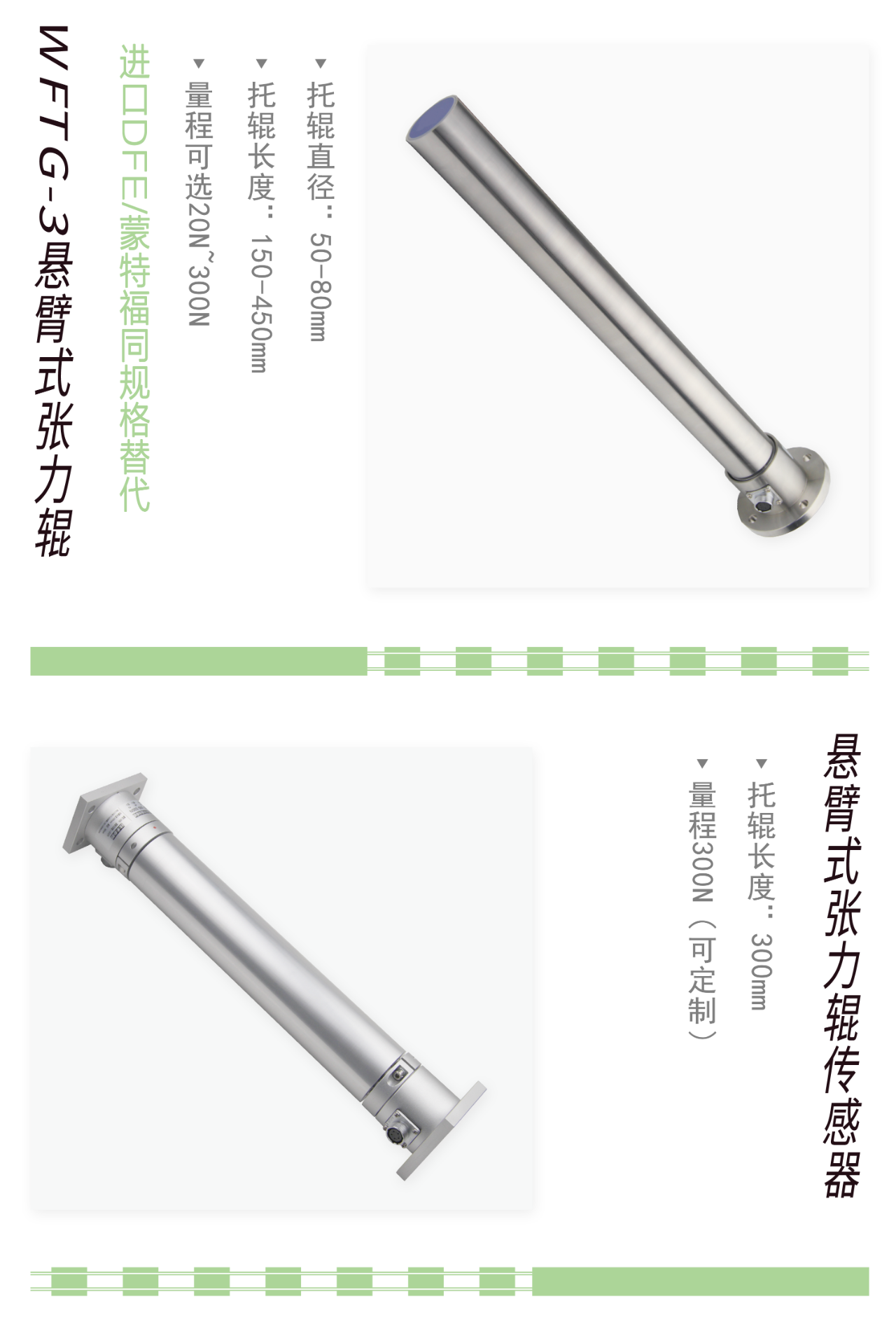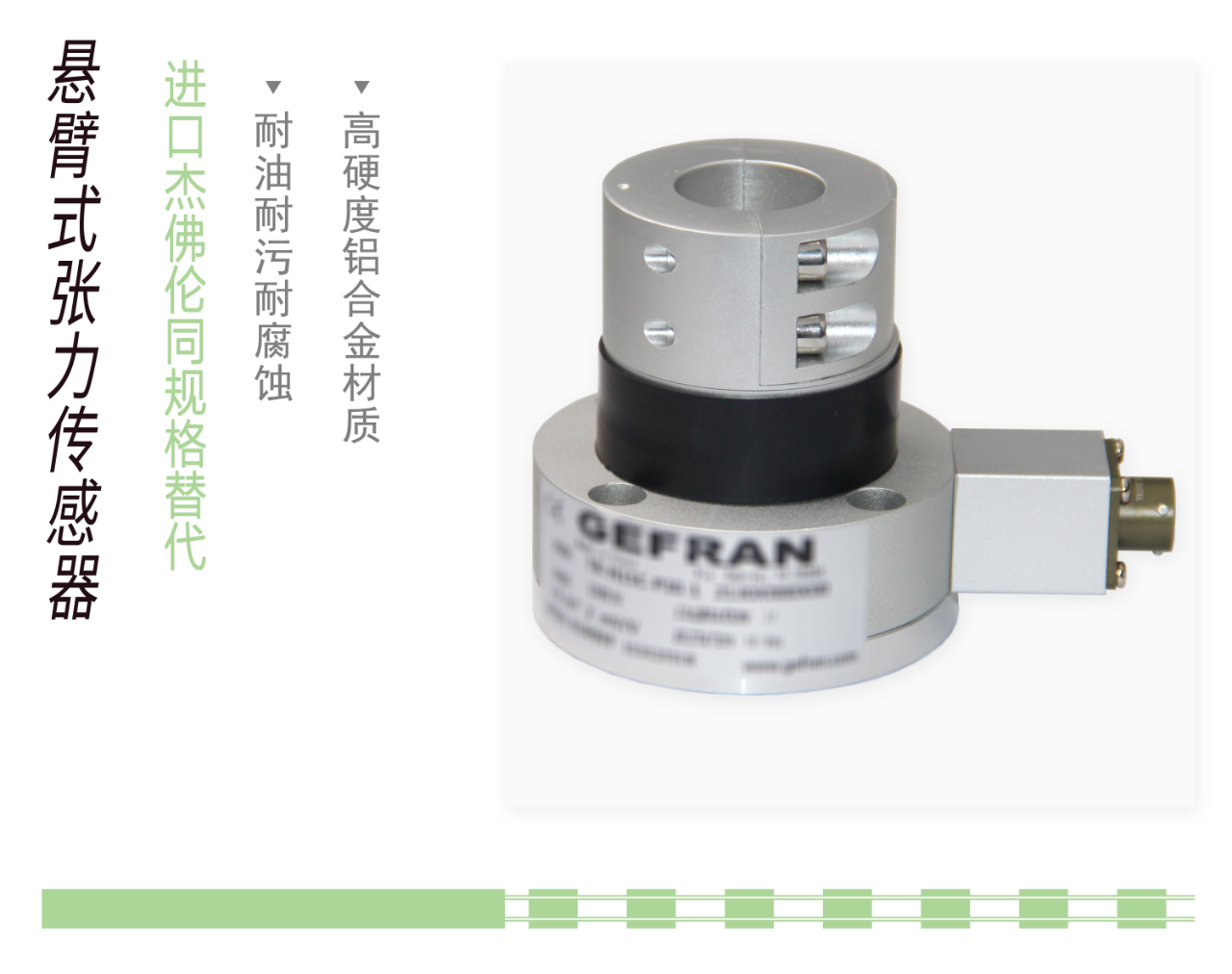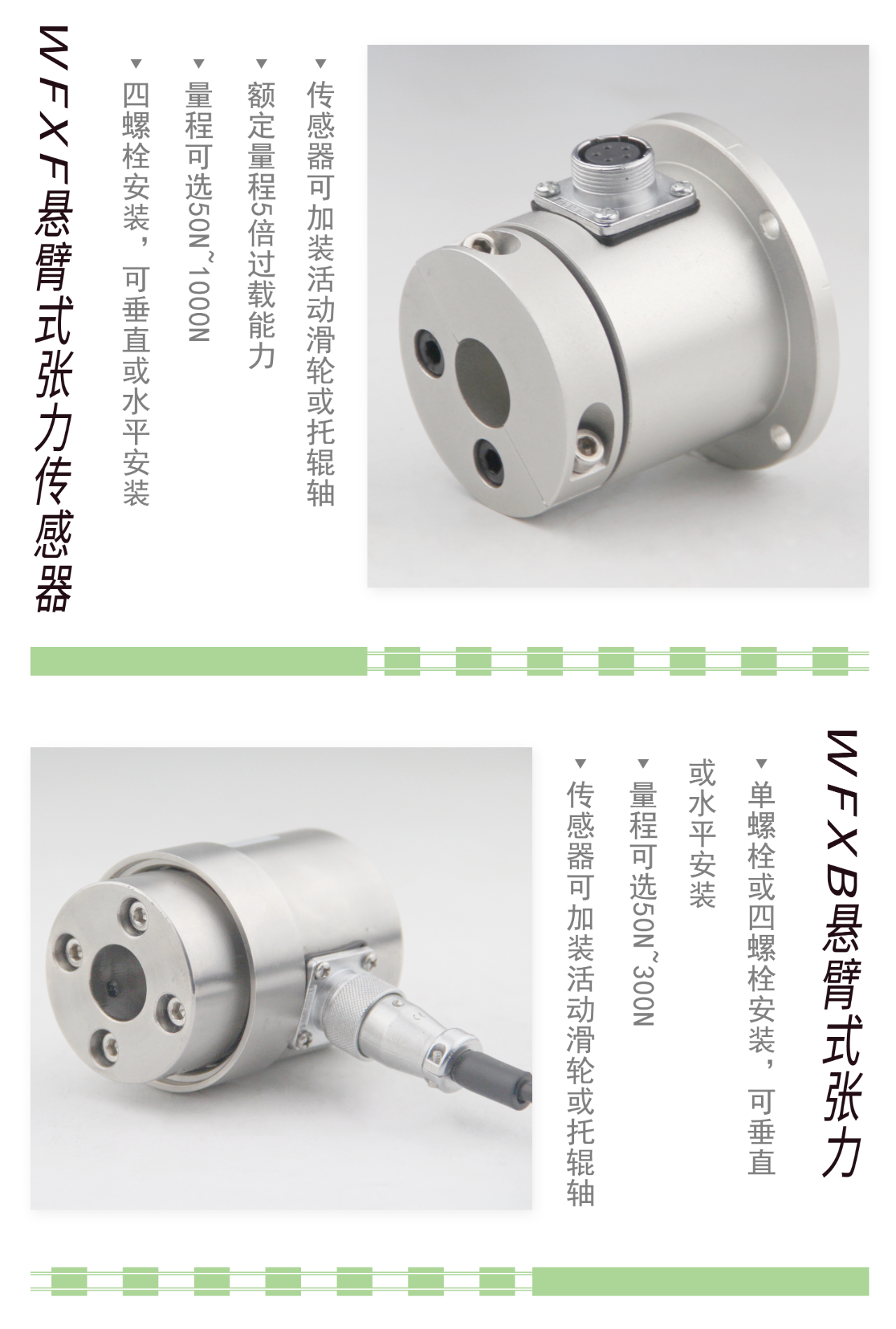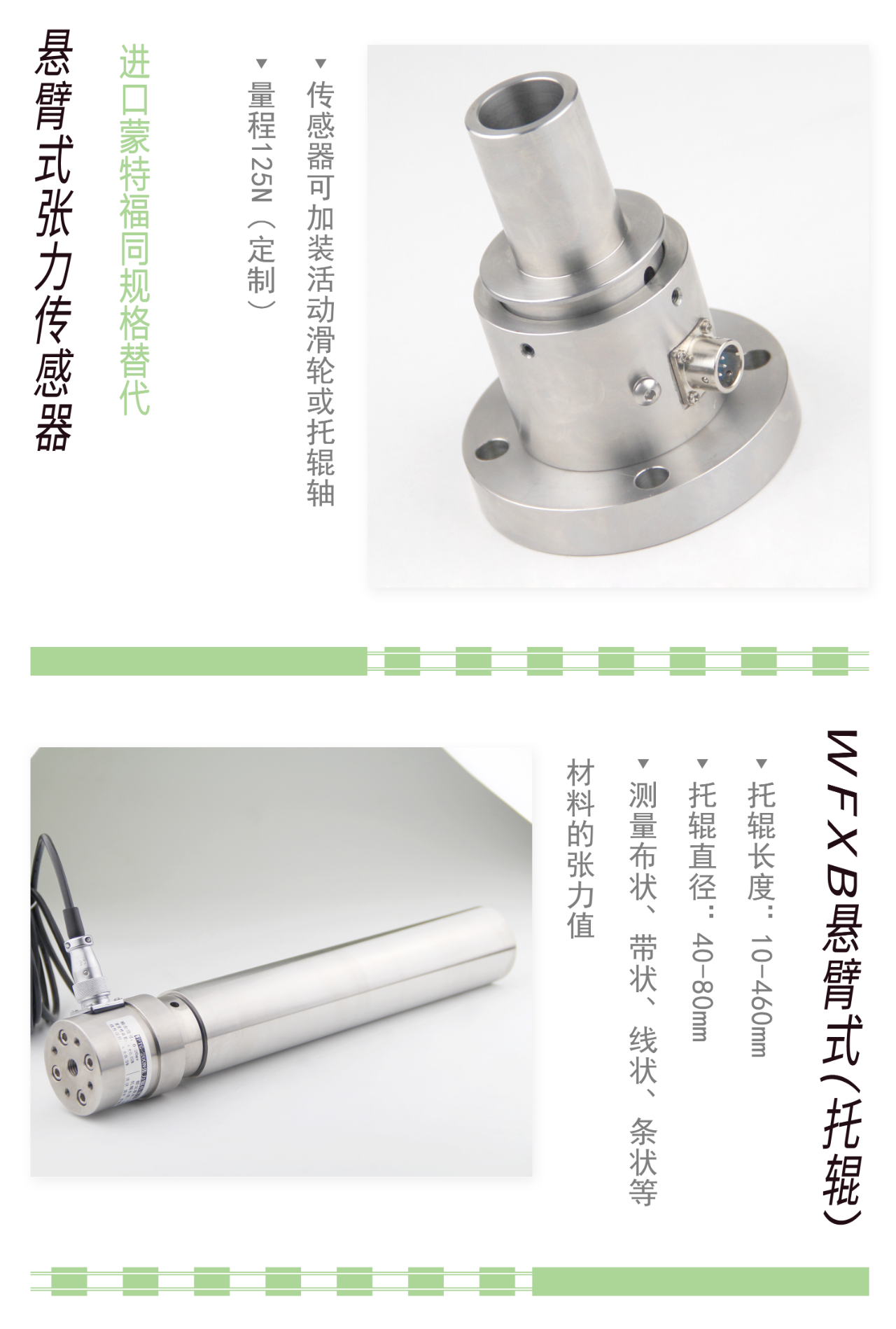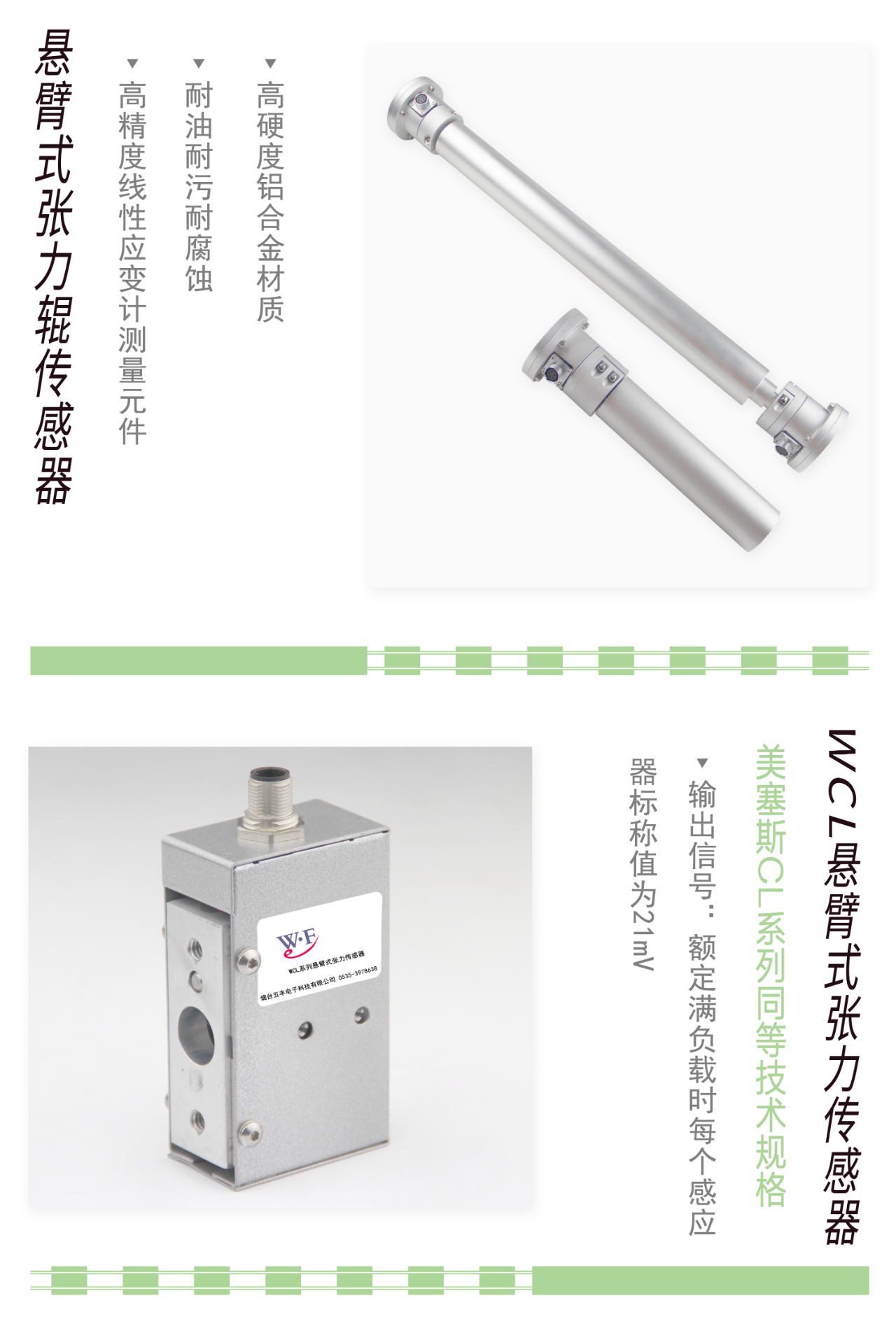 懸臂式張力傳感器采用應(yīng)變片傳感器原理,內(nèi)置雙懸臂梁,同時貼于懸臂梁上的四片應(yīng)變片組成惠斯通全橋,當(dāng)外部在懸臂梁上產(chǎn)生力矩時,此應(yīng)變?nèi)珮蚴テ胶舛敵霾铑~電壓,即傳感器輸出電壓。