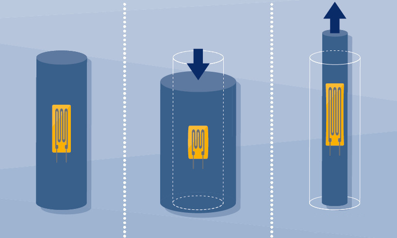 為了生產(chǎn)力傳感器,除了應(yīng)變片外還需要一個彈性體 - 例如采用不銹鋼。應(yīng)變片將牢固地黏貼在彈性體上。我們采用彈性體最簡單的形式 - 鋼圓柱體來進(jìn)行說明。