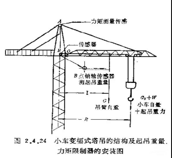 圖2.4.24為小車變幅式塔吊的結(jié)構(gòu)示意圖,其中,R.W兩參數(shù)是變量。為了設(shè)備安全,需要控制的傾翻力矩是M=R.W、可似用類似上述的單參數(shù)測量原理,在B點(diǎn)安裝側(cè)量水平拉力的軸銷形剪切傳感器,計量起吊重物的重量(采樣重物重量的1/2)??稍贏點(diǎn)安裝同樣的軸銷剪切傳感器,提供力矩報警信號。