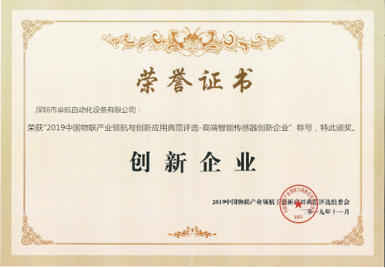 優(yōu)秀的創(chuàng)新產(chǎn)品往往離不開背后同樣優(yōu)秀的企業(yè),在產(chǎn)品獲得殊榮的同時(shí),企業(yè)自然也不例外。本屆高交會(huì)期間,卓航精密斬獲“2019中國五連產(chǎn)業(yè)領(lǐng)航與創(chuàng)新應(yīng)用典范評(píng)選——高端智能傳感器創(chuàng)新企業(yè)”稱號(hào)。